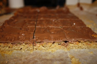 Smält margarinet. Blanda alla ingredienser utom nougaten i en bunke, platta ut i en liten plåt, gör dubbel sats om du har en större plåt.